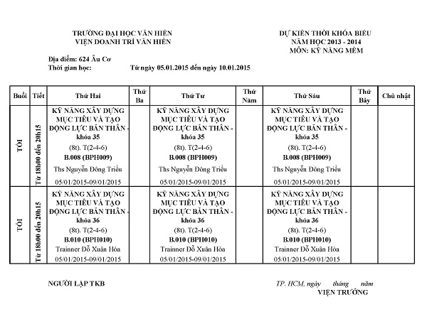 THỜI KHÓA BIỂU KỸ NĂNG MỀM TỪ 05/01 ĐẾN 10/01/2014